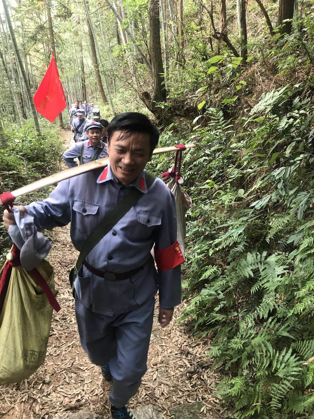 紅軍挑糧小道是井岡山近年來新開發(fā)的的一條徒步體驗(yàn)式線路。這條山路原是1928年紅軍從寧岡縣、茅坪鄉(xiāng)、大隴鎮(zhèn)一帶挑糧上山路線的一小段,小道全長3100多米,山上海拔1300多米,垂直高差約400米,甚是陡峭。當(dāng)年42歲的朱德和35歲的毛澤東在公務(wù)繁忙的情況下,毅然拿起扁擔(dān),帶領(lǐng)紅軍指戰(zhàn)員肩挑背馱地把30多萬斤糧食運(yùn)上了井岡山,解決了紅軍給養(yǎng)問題,支撐了割據(jù)井岡山工農(nóng)武裝的革命斗爭。學(xué)員們著紅軍裝行走在挑糧小道上,董事長段志春帶頭挑擔(dān),小道崎嶇、陡峭、狹窄、彎曲,學(xué)員們在艱難的前行中,仿佛依舊可以感受到革命先烈腳板的余溫,感受著當(dāng)年紅軍的革命熱情。